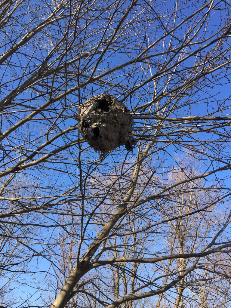 Every day last summer I walked beneath these limbs, never imagining that I should be walking in fear. Then the fall winds blew and carried away the nest’s protective camouflage. And on a crystal clear, blue-sky winter’s morning, my head tossed back, eyes heavenward, I caught sight, for the first time, of what had eluded my vision for all those months: the largest hornet nest I have ever seen.